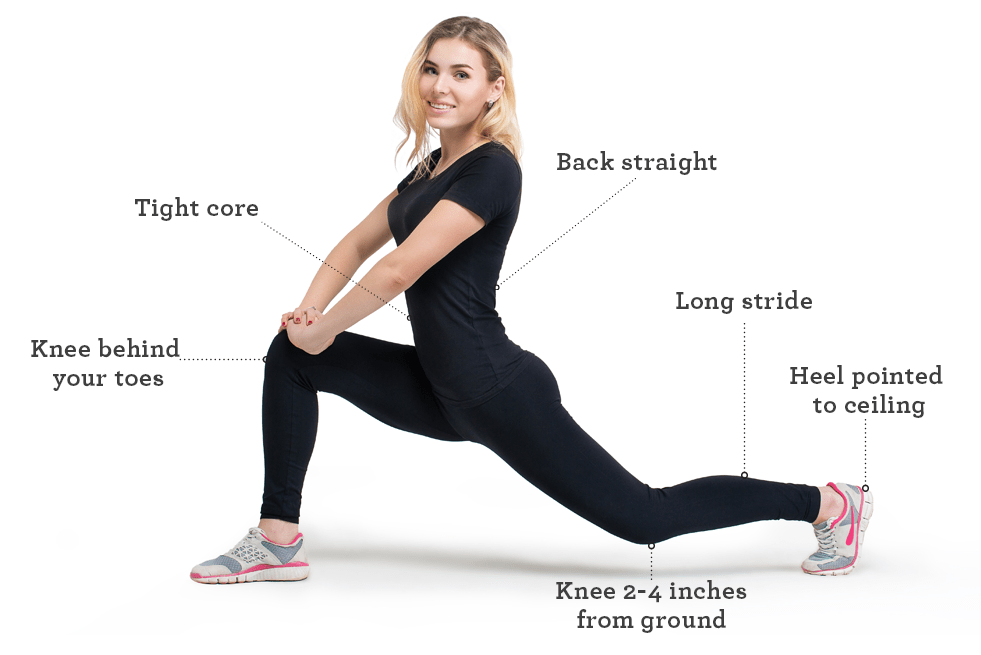 This one is the most popular exercise. It is mainly because it allows you to work the muscles of the legs and buttocks. So, stand up straight, back and shoulder blades straight and hands along the body. Your feet need to be below the hips. This is the starting position. When you are here, you can start the attacks. Just take a step forward and keep your body straight. Then, scroll down and transfer the weight of the body to the front.