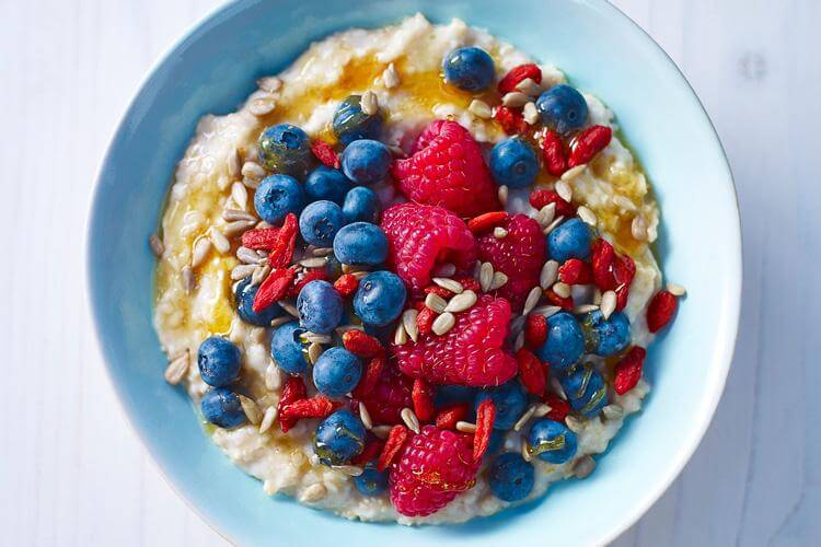 Scoop the oats into a bowl and top with berries. Add nuts, dried fruit, or additional toppings desired. Drizzle with honey to add a touch of sweetness.