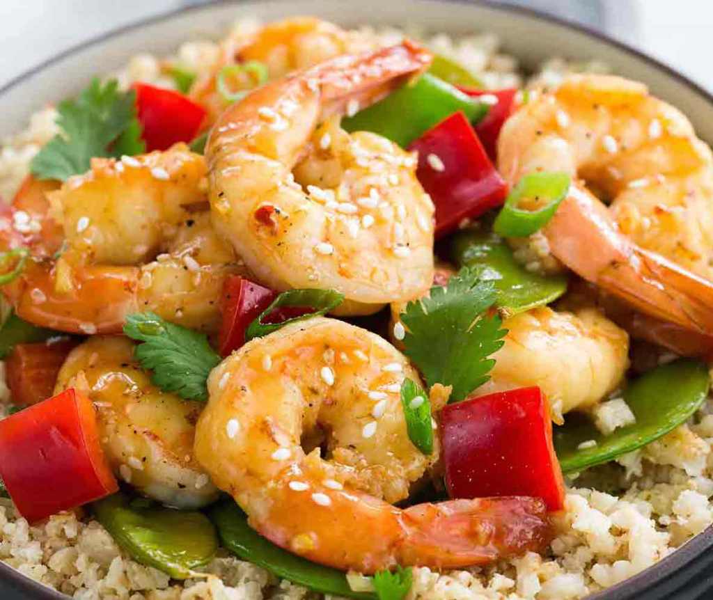 Shrimp is a good source of protein and other important nutrients like selenium, B12, and phosphorus. The brown rice adds fiber to give the meal some staying power. You can easily customize this dish by adding more of your favorite vegetables or substituting the shrimp for chicken.